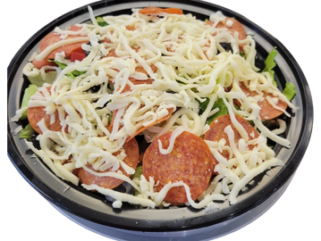 Cruton, Cheese, Pepperoni, Black Olives and Tomatos.