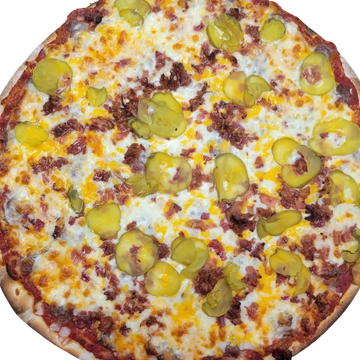 Sauce, Ground Beef, Breakfast Bacon, Pickles, Cheddar Cheese and Onions.