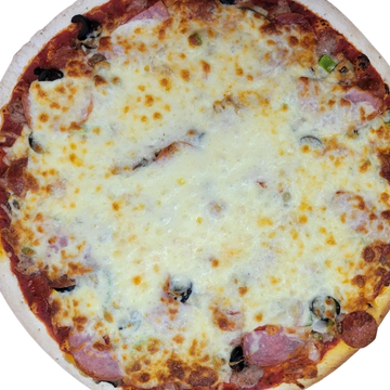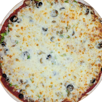 Sausage, Pepperoni, Canadian Bacon, Fresh Mushrooms, Onions, Green Peppers, Black Olives and Green Olives.